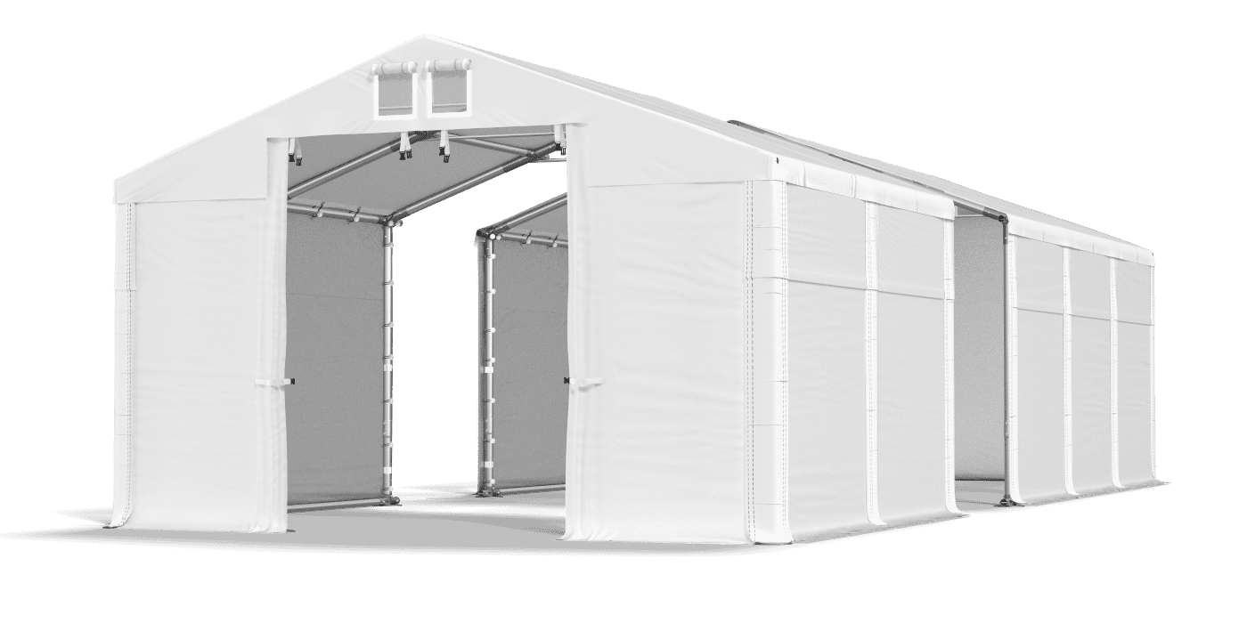 Mocna, pełna plandeka z PVC chroni zawartość namiotu przed zanieczyszczeniami oraz wpływem wilgoci i promieniowania UV. Szczelne poszycie namiotu magazynowego umożliwia przechowywanie towarów, garażowanie pojazdów. Szeroki fartuch retencyjny usprawnia odprowadzanie wody podczas opadów, a podwójne wywietrzniki regulują wymianę powietrza. Plandeka nie posiada okien, co uniemożliwia wgląd do namiotu z zewnątrz.