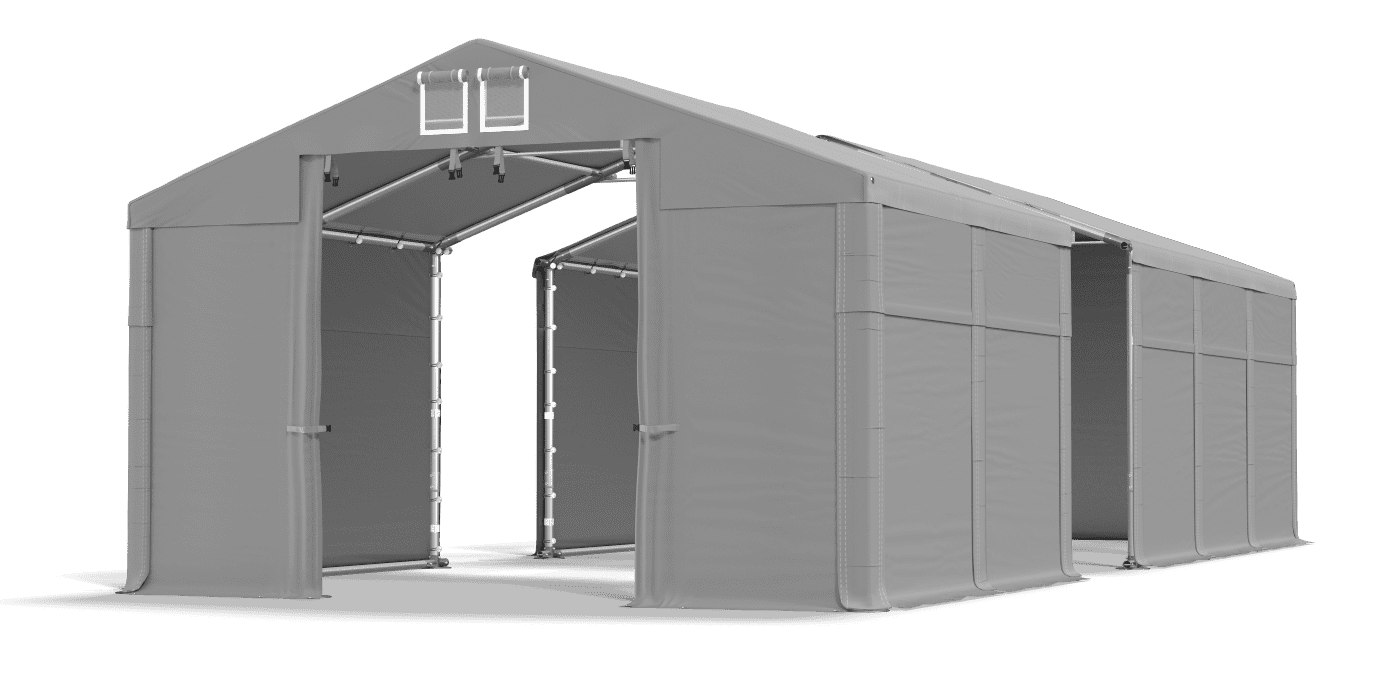 Pełne poszycie bez okien jest wykonane z PVC o wysokiej gramaturze. Plandeka jest wodoodporna i odporna na promieniowanie UV. Dlatego w namiocie magazynowym możemy przechowywać materiały budowlane, plony rolne, surowce i towary handlowe. Pod zadaszeniem możemy garażować pojazdy, meble ogrodowe i sprzęt sportowy. Plandeka bez okien jest niezwykle szczelna, a ponadto chroni zawartość zadaszenia przed wglądem z zewnątrz.