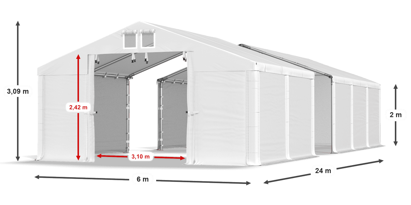 Trwała, trudnopalna plandeka z PVC zapewnia bezpieczne warunki do przechowywania materiałów budowalnych, towarów handlowych, pojazdów i maszyn rolniczych. Pełne poszycie bez okien jest wyjątkowo szczelne, wodoodporne i nie przepuszcza dziennego światła. Wnętrze namiotu magazynowego jest niewidoczne dla osób postronnych. To doskonały namiot garażowy i hala przemysłowa. Plandeka posiada system szybkiej zmiany długości Multi-size.