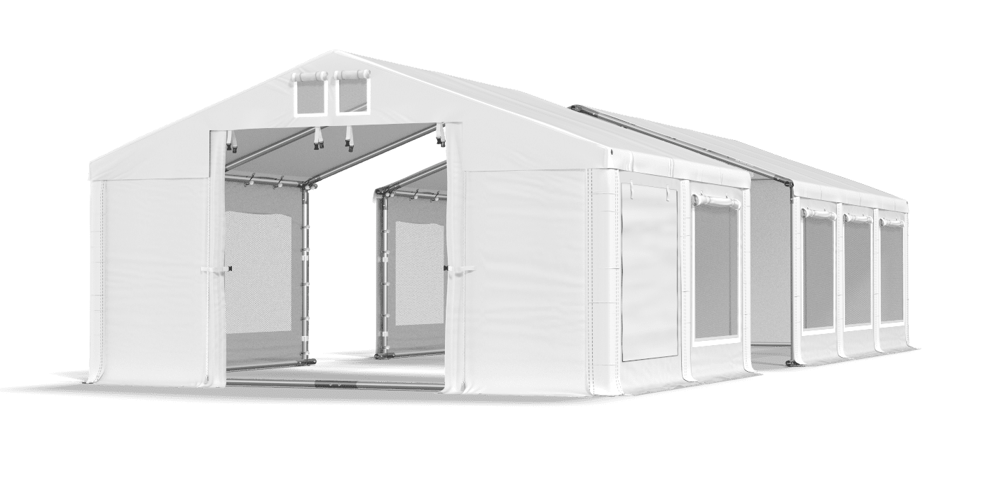 Plandeka z oknami wyposażonymi w moskitiery zapewnia przepływ świeżego powietrza w upalne dni. Poszycie jest odporne na wilgoć i promieniowanie UV, dlatego może być wykorzystywane podczas organizacji plenerowych przyjęć rodzinnych i firmowych. Moskitiery są niezwykle przewiewne, a jednocześnie chronią stoły i bufety przed latającymi owadami. W razie ochłodzenia okna możemy zasłonić roletami, które uszczelnią namiot imprezowy.