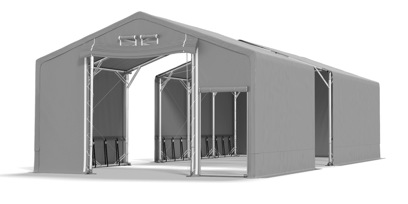 Pełna, szara plandeka wykonana z PVC o wysokiej gramaturze doskonale izoluje przechowywane pod zadaszeniem towary i pojazdy od czynników atmosferycznych. Mocna, całoroczna plandeka została wyposażona w dodatkowe mniejsze wejście, które znajduje się obok dużej bramy wjazdowej. To doskonały namiot magazynowy i solidny namiot garażowy. Wodoodporne i trudnopalne poszycie umożliwia przeprowadzanie prac warsztatowych i produkcyjnych w hali namiotowej.