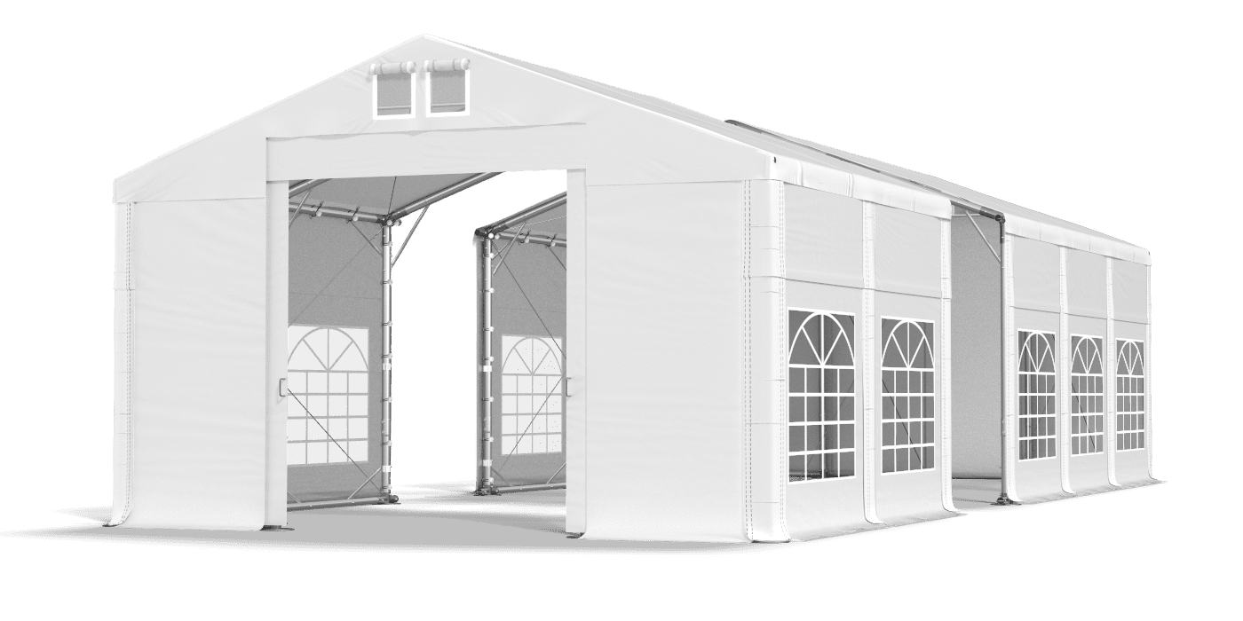 "Solidna plandeka z oknami witrażowymi wykonana jest z PVC o wysokiej gramaturze. Poszycie jest wodoodporne i odporne na promieniowanie UV. Plandeka namiotu imprezowego zapewnia suchą i zacienioną przestrzeń na stoły, bufety i parkiet do tańca. Eleganckie ona witrażowe doskonale komponują się z dekoracjami imprezowymi i gwarantują dopływ dziennego światła do wnętrza zadaszenia. Poszycie zostało wyposażone w system łatwej zmiany długości Multi-size. "