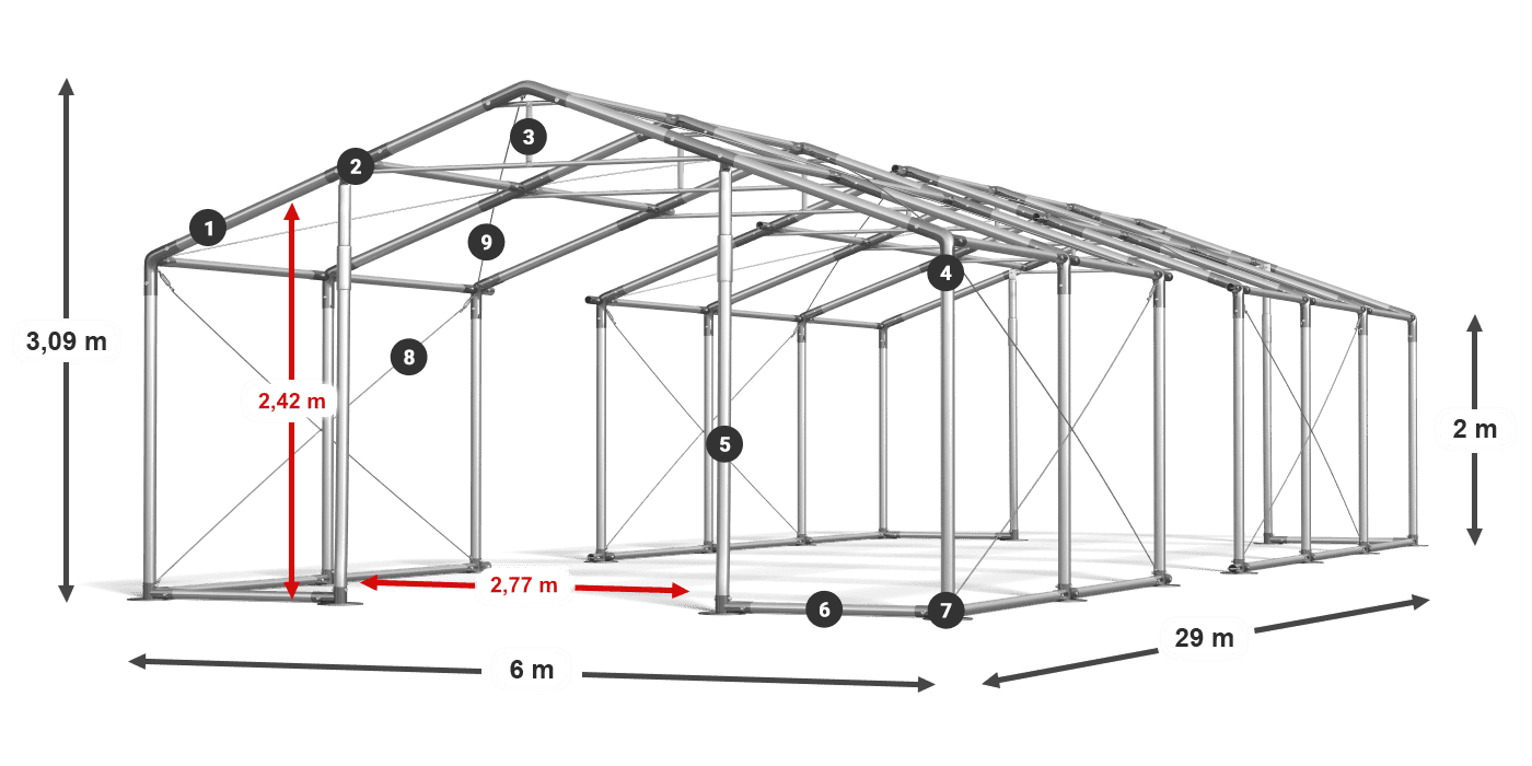 Wysokości w namiotach magazynowych oraz imprezowych mogą być szybko zmienione, a to dzięki modułowej konstrukcji, która pozwala na podniesienie namiotu o 0,5m lub o 1m. Najniższa możliwa wysokość ściany bocznej to 2m, a najwyższa to 4m.
