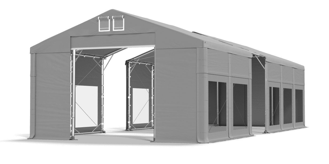 Poszycie wyposażone w transparentne boki wykonane jest z PVC o wysokiej gramaturze. Plandeka jest wodoodporna i odporna na promieniowanie UV, dlatego gwarantuje suchą i zacienioną przestrzeń podczas organizacji imprez rodzinnych i przyjęć biznesowych. Transparentne ściany boczne zapewniają doskonałe doświetlenie stołów i bufetów. To także doskonały namiot handlowy i altana namiotowa. Plandeka posiada system szybkiej zmiany długości Multi-size.