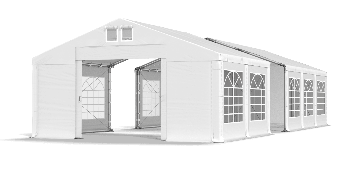 Mocna plandeka wykonana jest z PVC o wysokiej gramaturze. Posiada estetyczne okna witrażowe, które dostarczają dużo dziennego światła. Eleganckie poszycie wykorzystywane jest w namiotach imprezowych, namiotach gastronomicznych i w namiotach handlowych. Wodoodporna i odporna na promieniowanie UV plandeka chroni stoły i bufety, zapewniając suchą i zacienioną przestrzeń dla gości. Namiot z oknami witrażowymi to także doskonała altana ogrodowa.