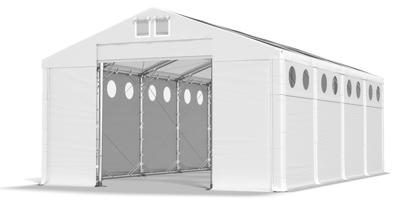 Plandeka wyposażona jest w małe okna doświetlające oraz transparentny dach. Dzięki temu wnętrze namiotu magazynowego jest dobrze doświetlone, a jednocześnie niewidoczne dla osób z zewnątrz. Poszycie wykonane jest z trwałego PVC, odpornego na wilgoć i promieniowanie UV. Szczelny namiot garażowy umożliwia przechowywanie towarów handlowych, sprzętu sportowego i pojazdów. Pod zadaszeniem można przeprowadzać prace związane z montażem, produkcją i segregacją. Poszycie zostało wyposażone w system łatwej zmiany długości Multi-size.