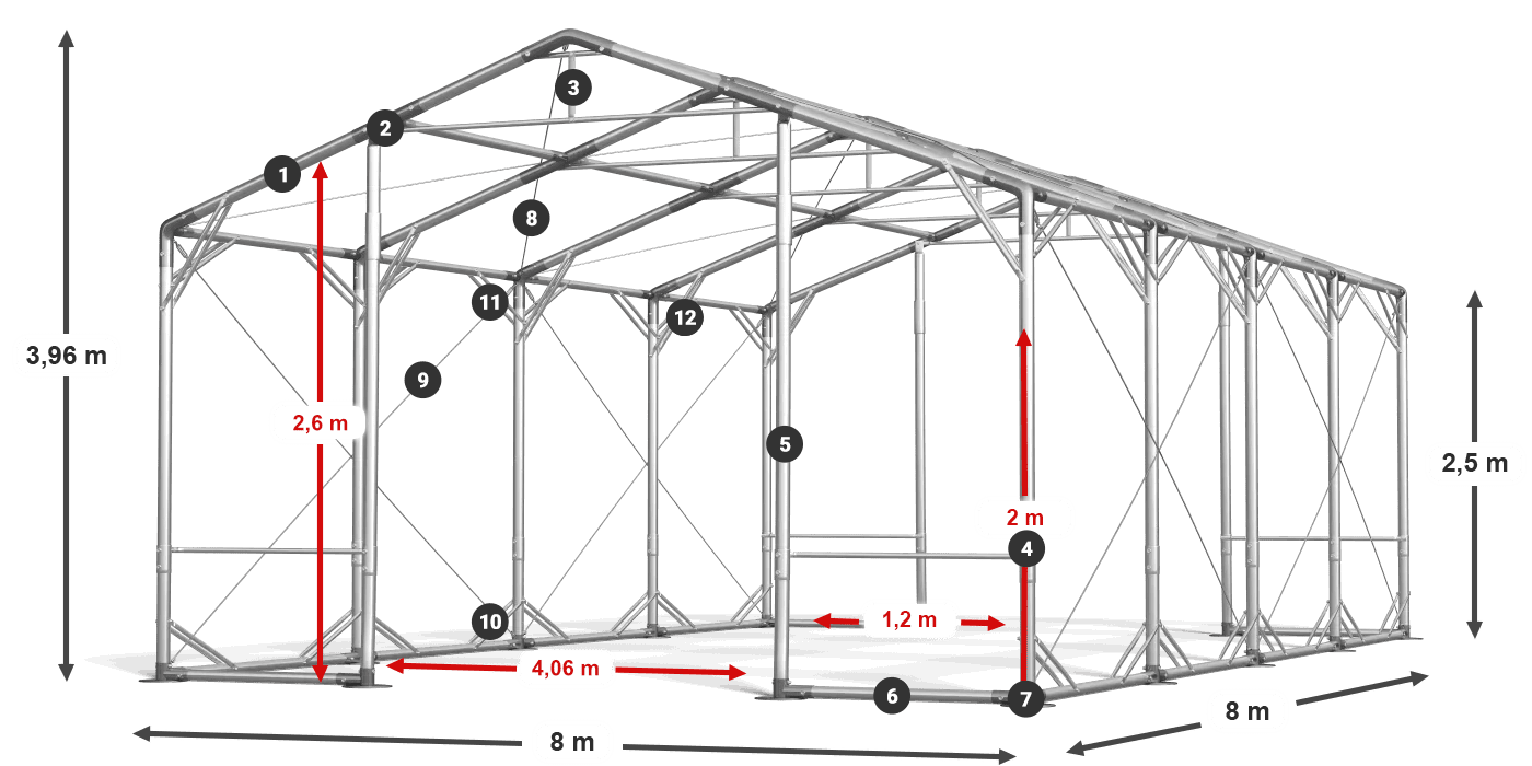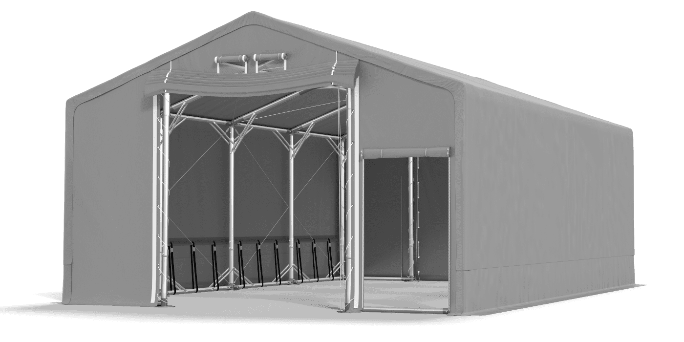 Pełna, szara plandeka wykonana z PVC o wysokiej gramaturze doskonale izoluje przechowywane pod zadaszeniem towary i pojazdy od czynników atmosferycznych. Mocna, całoroczna plandeka została wyposażona w dodatkowe mniejsze wejście, które znajduje się obok dużej bramy wjazdowej. To doskonały namiot magazynowy i solidny namiot garażowy. Wodoodporne i trudnopalne poszycie umożliwia przeprowadzanie prac warsztatowych i produkcyjnych w hali namiotowej.