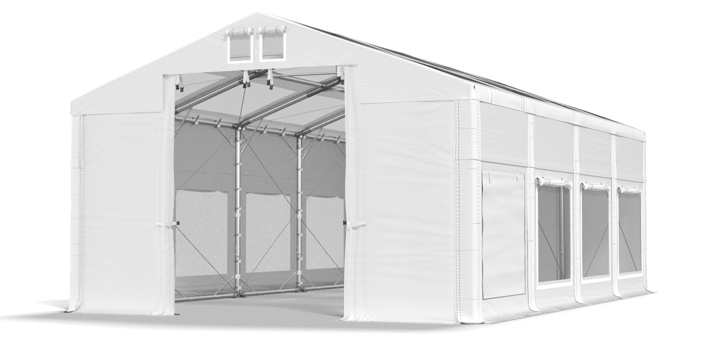 Plandeka wyposażona w okna z moskitierami jest niezwykle przewiewna, a jednocześnie chroni stoły i bufety przed latającymi owadami. Transparentny dach gwarantuje pełne doświetlenie wnętrza namiotu imprezowego. Poszycie wykonano z trwałego PVC o wysokiej gramaturze. Jest wodoodporne, szczelne i odporne na promieniowanie UV. Dzięki temu w namiocie eventowym można organizować plenerowe przyjęcia, pikniki rodzinne i firmowe eventy. Poszycie zostało wyposażone w system łatwej zmiany długości Multi-size.