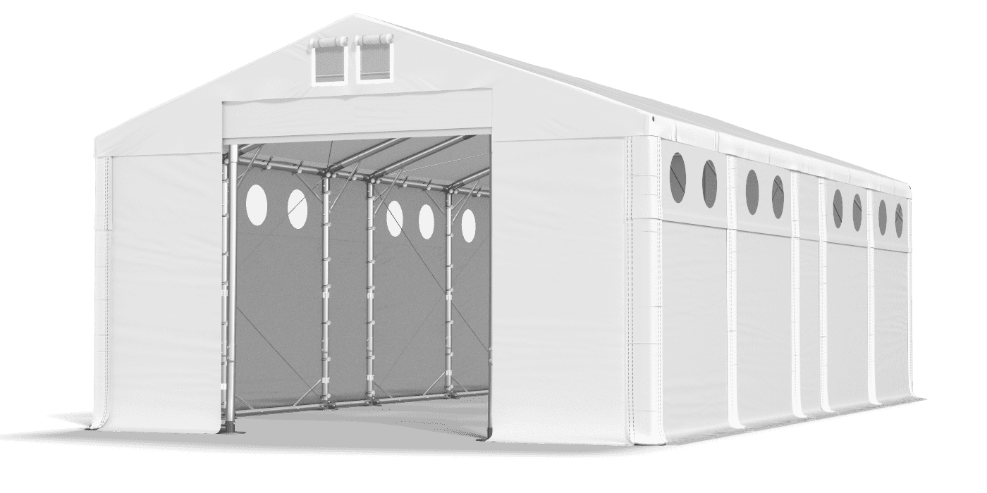Plandeka z okrągłymi oknami doświetlającymi doskonale sprawdzi się podczas wykonywania napraw i prac warsztatowych, ponieważ zapewnia dopływ naturalnego, dziennego światła. Poszycie wykonane jest z mocnego PVC, które jest odporne na wilgoć i promieniowanie UV. Małe okna umieszczone są w górnej części ścian pocznych, dlatego ograniczają widoczność wnętrza namiotu osobom postronnym. To doskonały namiot magazynowy i namiot garażowy.
