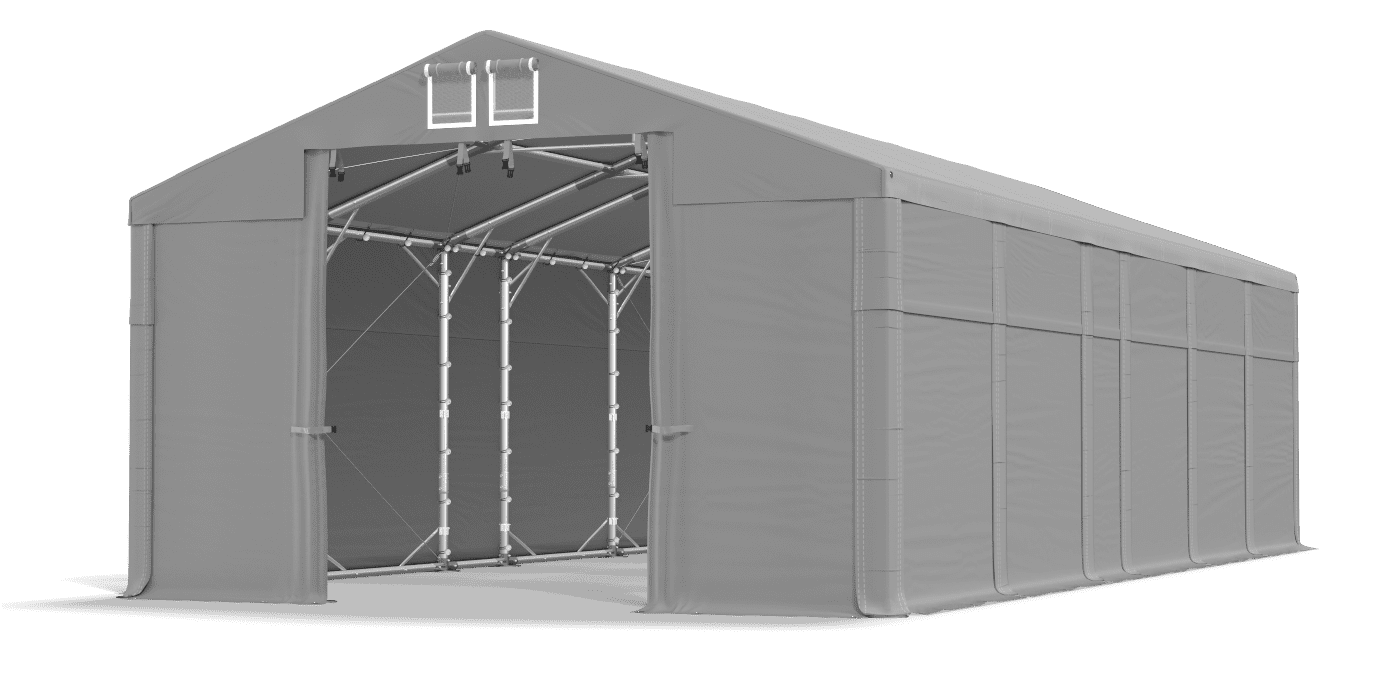 Pełna i wytrzymała plandeka z PVC zapewnia bezpieczną przestrzeń do magazynowania towarów, garażowania pojazdów i przechowywania plonów. Pod zadaszeniem możemy trzymać materiały budowlane, surowce, meble ogrodowe i sprzęt sportowy. Poszycie jest wodoodporne, szczelne i odporne na promieniowanie UV. Ściany boczne doskonale do siebie przylegają i nie posiadają okien, dlatego wnętrze namiotu magazynowego jest niewidoczne z zewnątrz. Plandeka została wyposażona w system łatwej zmiany długości Multi-size.