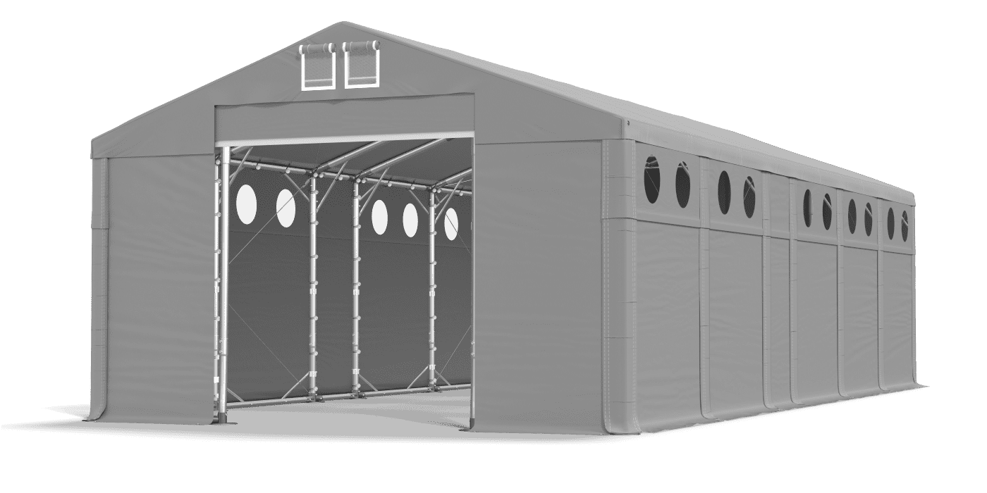 Poszycie z oknami doświetlającymi gwarantuje dopływ dziennego światła do wnętrza namiotu magazynowego. Plandeka z solidnego PVC jest odporna na wilgoć i promieniowanie UV. Pod zadaszeniem można magazynować towary, przeprowadzać naprawy, wykonywać prace związane z produkcją i segregacją. Poszycie zostało wyposażone w system łatwej zmiany długości Multi-size. Małe, okrągłe okna umieszczone są w górnej części ścian bocznych, dlatego wnętrze namiotu garażowego nie jest widoczne dla osób postronnych.