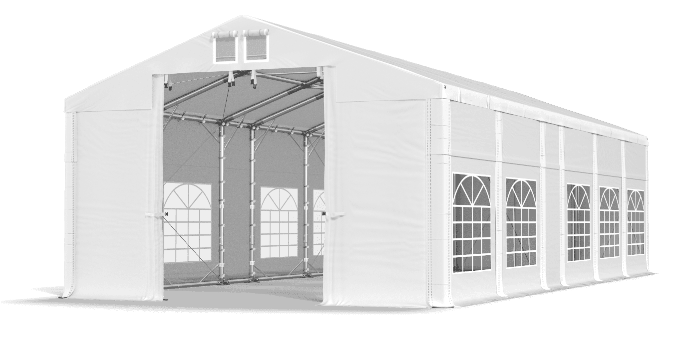 Trwała plandeka z oknami witrażowymi, chroni stoły i bufety przed wilgocią, wiatrem i promieniowaniem UV. Poszycie zbudowane jest z mocnego PVC. Eleganckie okna witrażowe są ozdobą namiotu imprezowego, a dodatkowo zapewniają dużo naturalnego światła. Trudnopalne poszycie zwiększa bezpieczeństwo podczas używania namiotu w celach gastronomicznych i cateringowych. Plandeka posiada system szybkiej zmiany długości Multi-size.