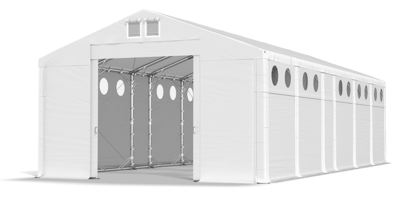 Mocne poszycie z oknami doświetlającymi umożliwia garażowanie pojazdów, magazynowanie towarów i wykonywanie prac związanych z montażem. Trudnopalna plandeka wykonana z PVC jest wodoodporna, szczelna i odporna na promieniowanie UV. W suchym i zacienionym namiocie magazynowym możemy przechowywać plony, materiały budowlane i surowce. Okrągłe okna doświetlające zapewniają naturalne światło. Plandeka posiada system szybkiej zmiany długości Multi-size.