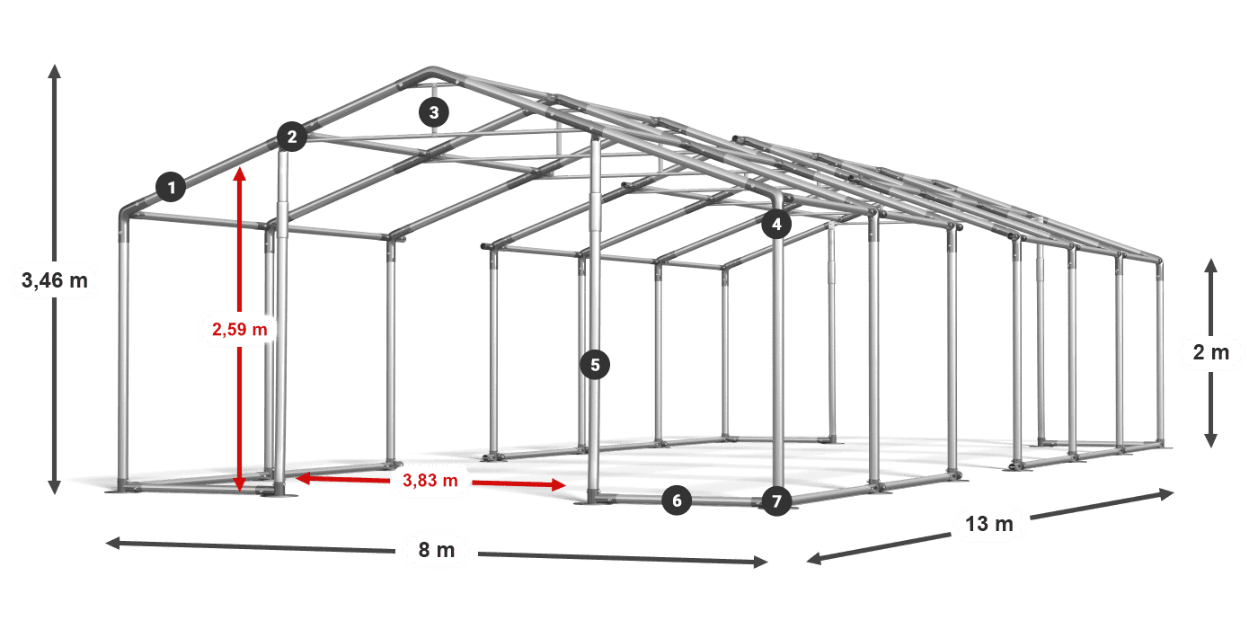 Wysokości w namiotach magazynowych oraz imprezowych mogą być szybko zmienione, a to dzięki modułowej konstrukcji, która pozwala na podniesienie namiotu o 0,5m lub o 1m. Najniższa możliwa wysokość ściany bocznej to 2m, a najwyższa to 4m.
