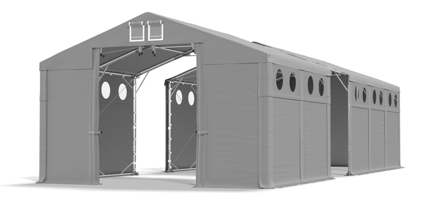 Poszycie z oknami doświetlającymi gwarantuje dopływ dziennego światła do wnętrza namiotu magazynowego. Plandeka z solidnego PVC jest odporna na wilgoć i promieniowanie UV. Pod zadaszeniem można magazynować towary, przeprowadzać naprawy, wykonywać prace związane z produkcją i segregacją. Poszycie zostało wyposażone w system łatwej zmiany długości Multi-size. Małe, okrągłe okna umieszczone są w górnej części ścian bocznych, dlatego wnętrze namiotu garażowego nie jest widoczne dla osób postronnych.