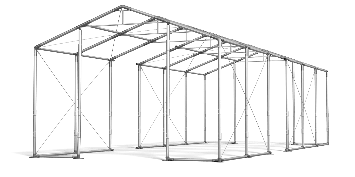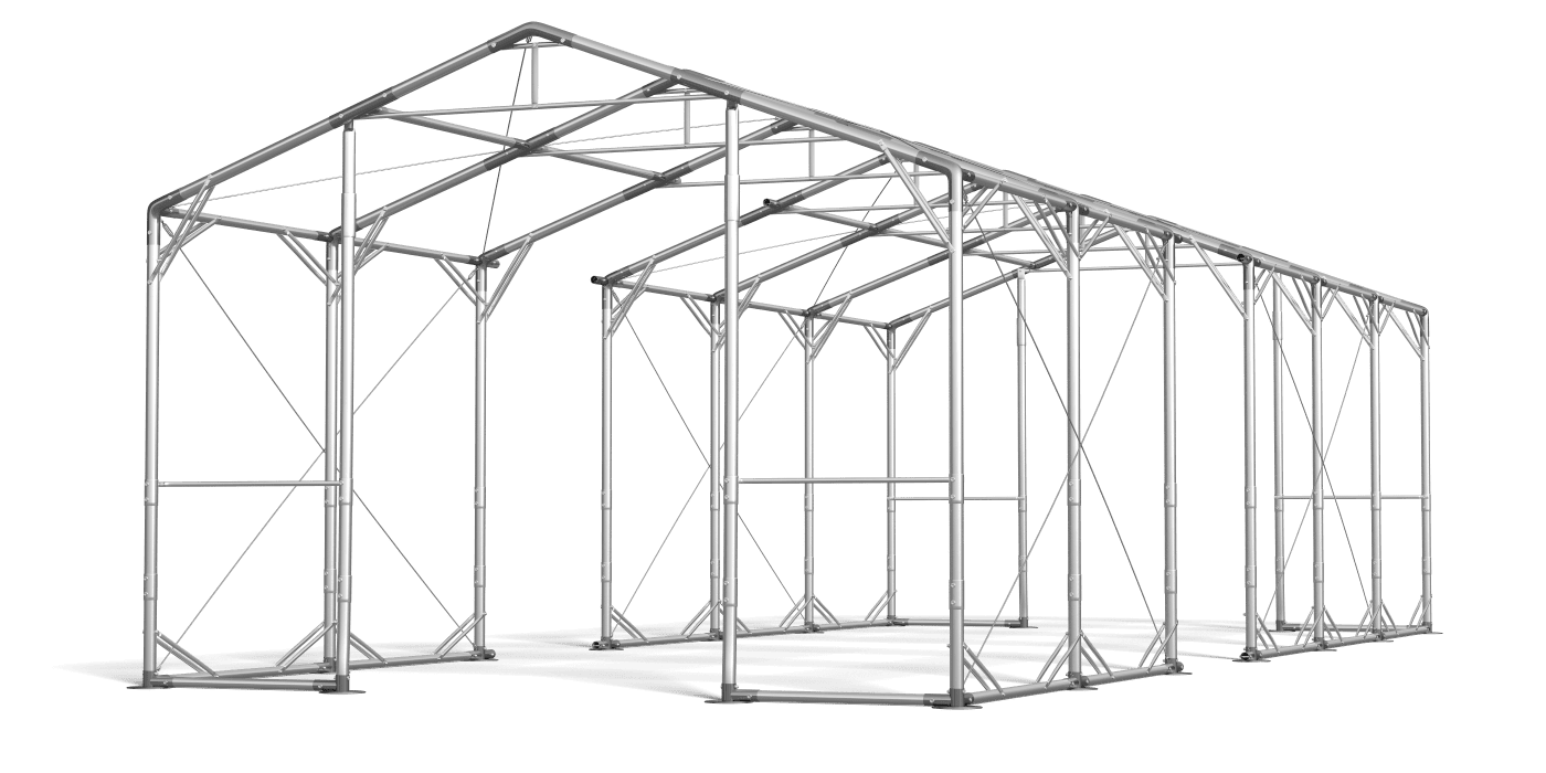 Dodatkowa konstrukcja składa się z ramy dolnej, wzmocnień górnych oraz zastrzałów poziomych i pionowych dachu. To rozwiązanie daje większą nośność oraz sztywność konstrukcji. Pozwala to również na użytkowanie namiotu podczas niekorzystnych warunków pogodowych.