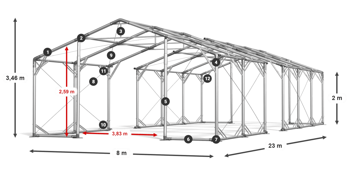 Na wszystkich ścianach bocznych zostały zastosowane dodatkowe poprzeczne wsporniki górne oraz dolne. Dzięki nim, namiot jest maksymalnie odporny na mocne i porywiste podmuchy wiatru. Jest to najskuteczniejszy sposób ochrony przed tego typu warunkami atmosferycznymi.