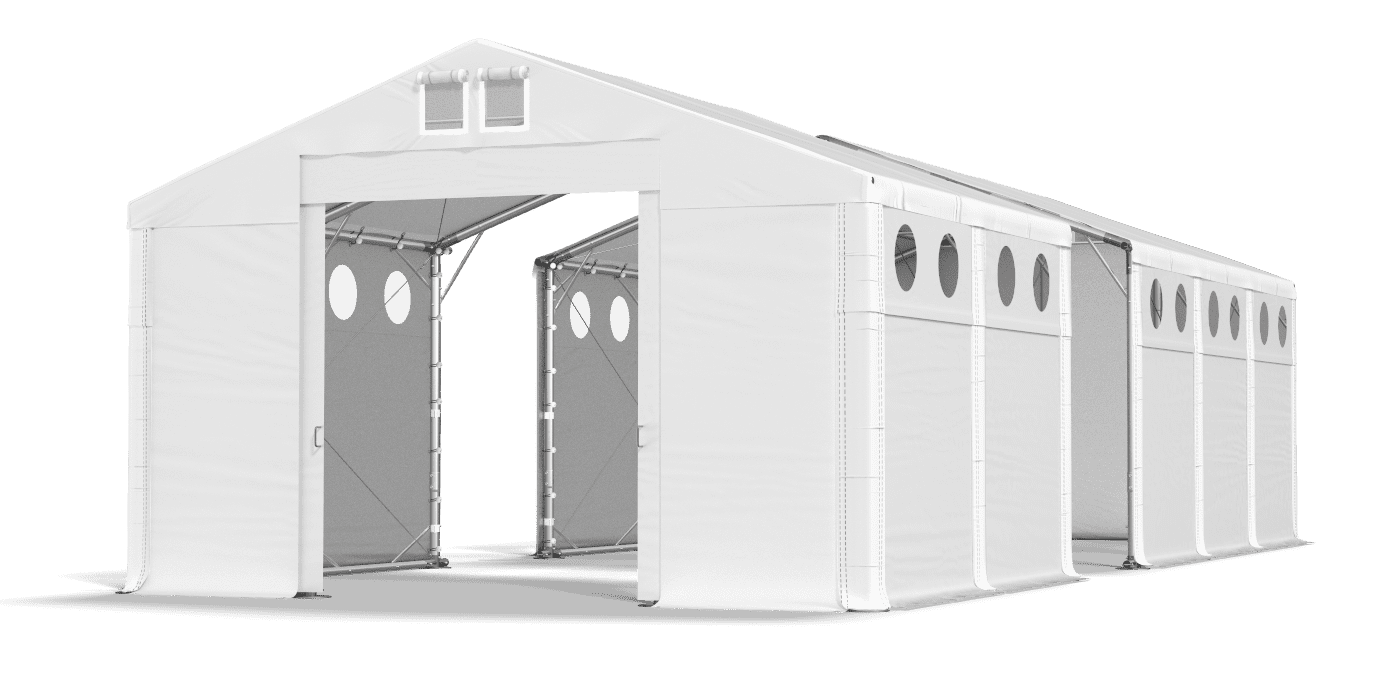 Plandeka z oknami doświetlającymi gwarantuje dopływ naturalnego światła. Poszycie wykonano z PVC o wysokiej gramaturze, które jest wodoodporne i odporne na promieniowanie UV. Dzięki temu pod zadaszeniem możemy przechowywać różnorodne towary, materiały budowlane i surowce. To także doskonałe namioty garażowe na pojazdy i sprzęt sportowy. Niewielkie okna doświetlające umieszczone są w górnej części plandeki, dzięki temu osoby z zewnątrz nie mogą zajrzeć do wnętrza namiotu magazynowego.